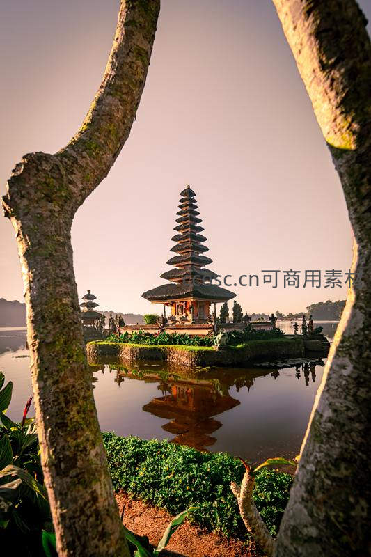 树影框景下的巴厘岛水神庙晨曦倒影