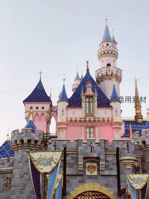 粉色墙体搭配深蓝色尖顶,金色装饰熠熠生辉,这座童话城堡仿佛从故事书中走出,唤起童年梦幻回忆。