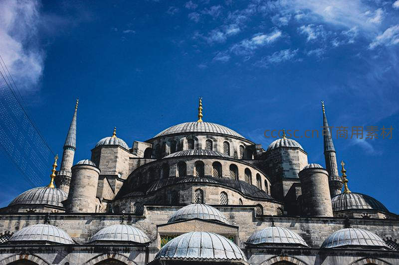 蓝天白云下的蓝色清真寺穹顶