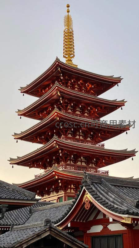 京都东寺五重塔以朱红漆木与鎏金宝珠为饰,在淡雅天空下尽显日式佛教建筑之美,庄重肃穆,承载千年信仰与工艺。
