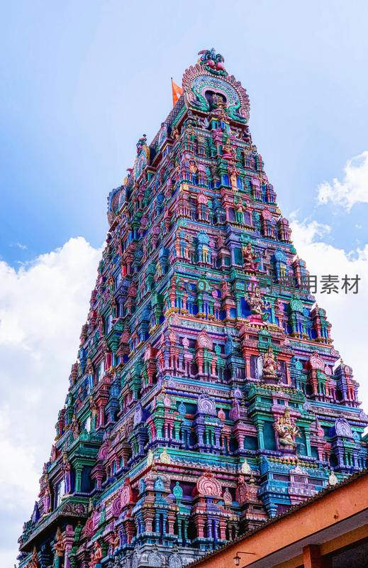 一座宏伟的南印度教寺庙高塔,布满精细雕刻与鲜艳彩绘,在晴朗天空下展现着古老宗教艺术的辉煌与庄严。