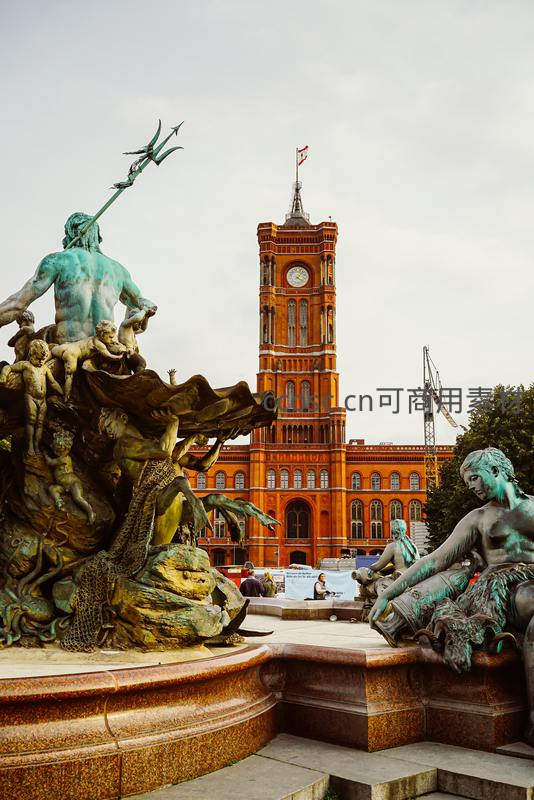 柏林市政厅前青铜海神雕像守护着历史红砖建筑