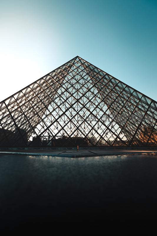 卢浮宫玻璃金字塔在黄昏阳光下,金属框架与玻璃反射出温暖光芒,倒影在水面上,展现现代建筑与古典艺术的完美融合。