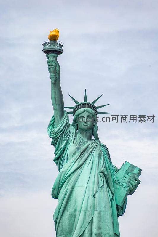自由女神像庄严矗立,右手高擎金色火炬象征光明与希望,左手紧握刻有日期的石板,绿铜色外衣在云天下更显历史厚重与精神象征。