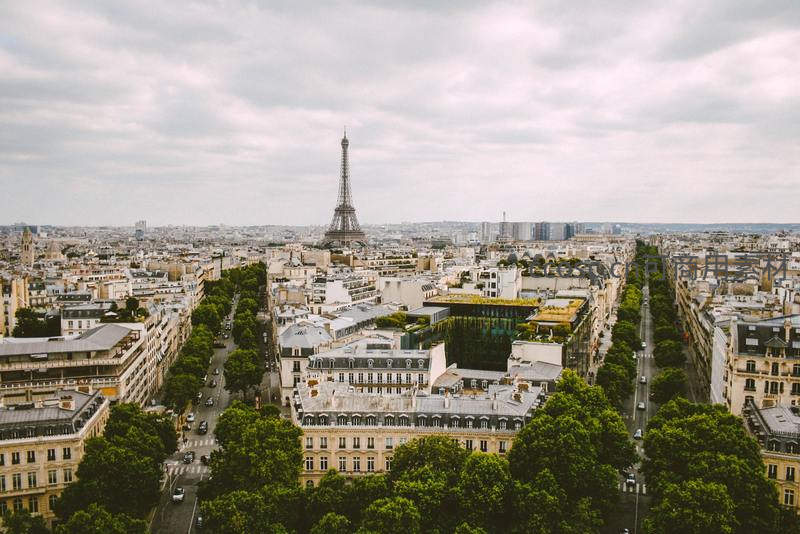 从高空俯瞰巴黎,标志性的埃菲尔铁塔耸立于城市中心,整齐的街道与绿荫交织,展现欧洲都市的经典风貌与生活气息。