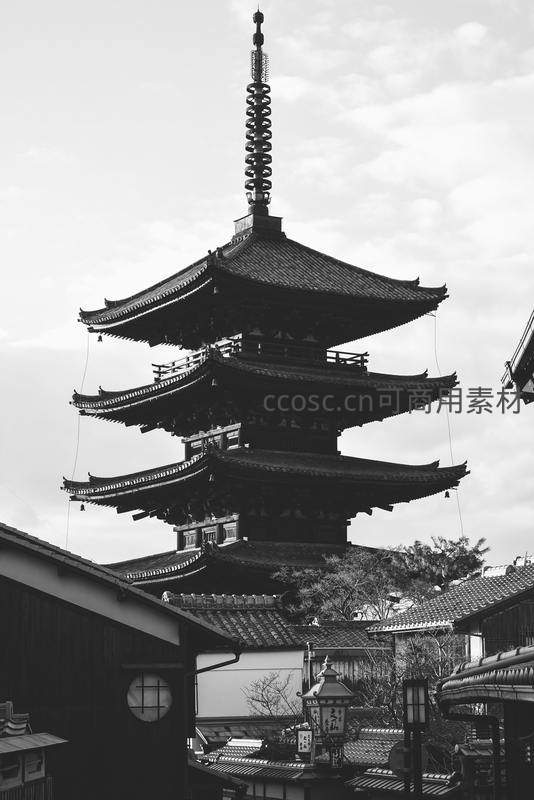 以经典的黑白影调捕捉日本传统多层宝塔的庄严神韵,飞檐翘角在云天下更显古朴厚重,周围屋舍与灯笼点缀,营造出宁静致远的禅宗意境。