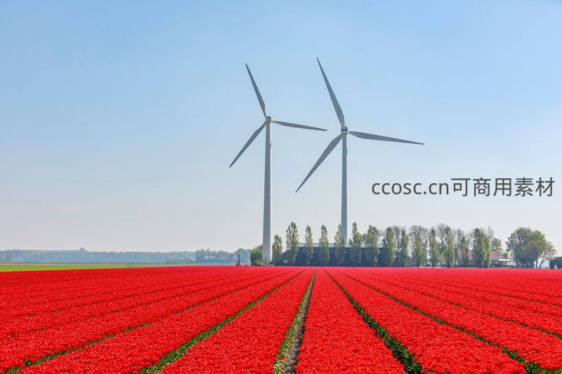 整齐排列的鲜红郁金香花田延伸至远方,两座白色风车矗立其间,蓝天之下形成经典荷兰田园风光,充满生机与诗意。