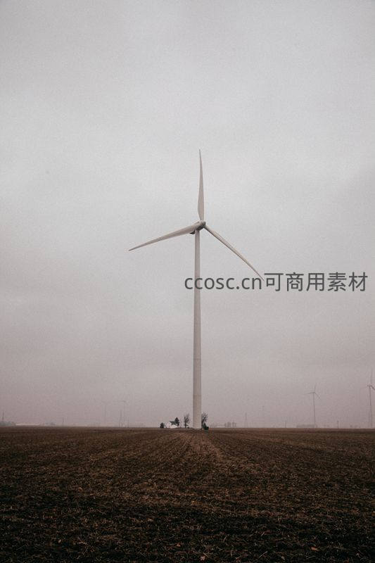 在灰蒙蒙的天空下,一座高大的白色风力发电机孤独地伫立在翻耕过的褐色土地上,远处隐约可见其他风车轮廓,展现清洁能源与自然环境的融合。