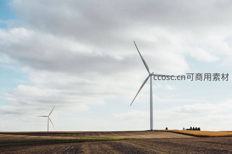 两座巨大的风力涡轮机在广阔无垠的田野中矗立,背景是飘动的云朵和清澈的蓝天,展现了可再生能源设施与田园风光和谐共存的宁静景象。