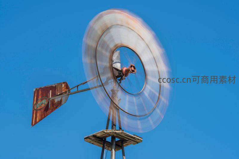 一架锈迹斑斑的古老风车在湛蓝天空下高速旋转,叶片因运动模糊形成圆形光轨,展现出时间与机械的诗意对话。