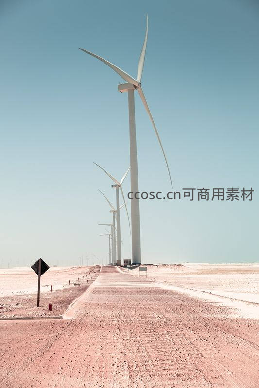 一排高大的白色风力发电机矗立在广袤的沙漠中,红色土路延伸至远方,蓝天无云,展现了现代能源与荒凉地貌的融合。
