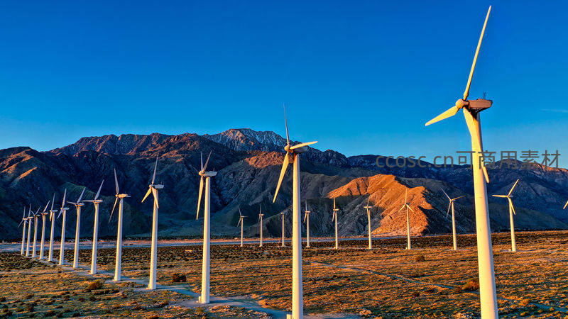 在广袤的沙漠中,一排排高大的风力发电机矗立在夕阳下,背景是连绵起伏的山脉和湛蓝的天空,展现了现代清洁能源与自然景观的和谐共存。