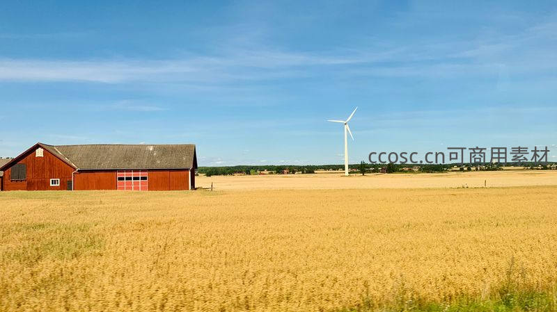 金黄麦田旁的红色农舍与风力发电机