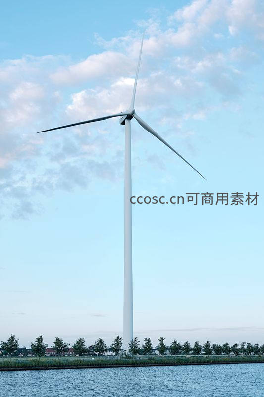 湖畔水边高耸入云的巨型风力发电机