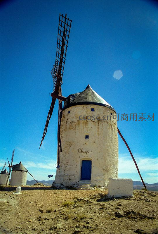 西班牙古老白墙风车在蓝天下的沧桑之美
