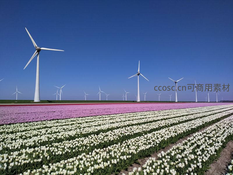 蔚蓝天空下,洁白的风车矗立在粉白相间的郁金香花田中,构成一幅现代科技与自然美景完美融合的画卷。