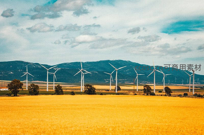 广阔的金色麦田延伸至远方,背景是连绵起伏的青山和一排排白色的风力发电机,展现了大地的丰饶与清洁能源的和谐共存。