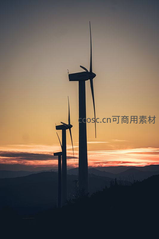 夕阳西下,几座风力发电机在山巅形成黑色剪影,绚丽的晚霞铺满天际,勾勒出一幅宁静而壮美的能源景观画卷。