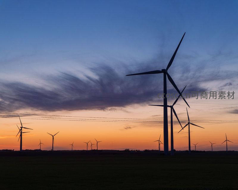多座现代风力发电机在绚丽的黄昏天空下形成黑色剪影,橙蓝渐变的云层与地面田野构成壮丽画面,象征清洁能源与自然和谐共存。
