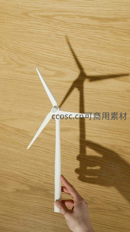 一只手轻握着一个白色的迷你风车模型,放置在浅色木纹桌面上,阳光从侧面照射,在桌面投下清晰而拉长的风车阴影,构图简洁。