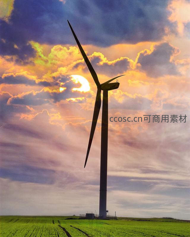 在绚丽多彩的夕阳晚霞映衬下,一座高大的风力发电机矗立于翠绿的田野之中,其巨大的叶片剪影与燃烧般的云层形成强烈对比,展现了清洁能源与自然美景的和谐共存。