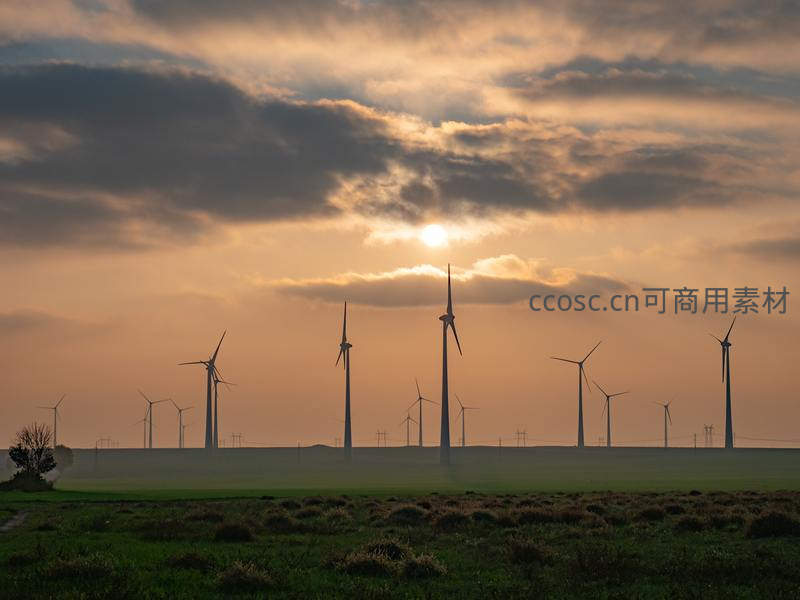 夕阳西下,金色的光芒穿透云层,为广袤田野上的风力发电机群镀上暖色光辉,构成一幅宁静而壮丽的现代田园画卷。