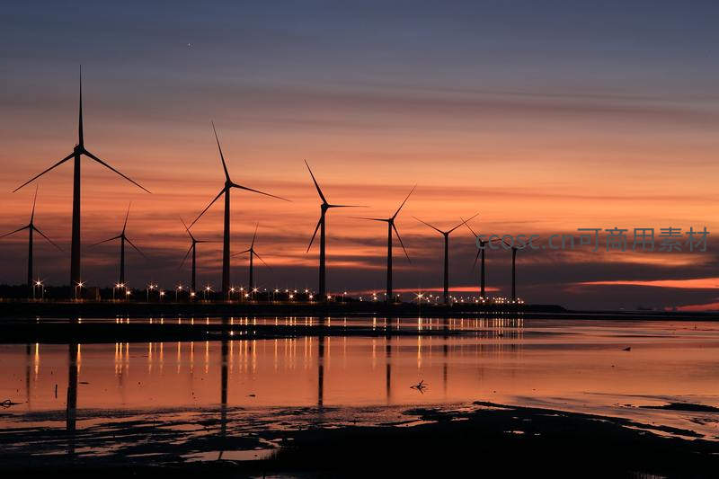 暮色四合,一排风力发电机的黑色剪影倒映在平静如镜的水面上,天空被染成温暖的橙红色,营造出静谧而充满力量的工业美学画面。