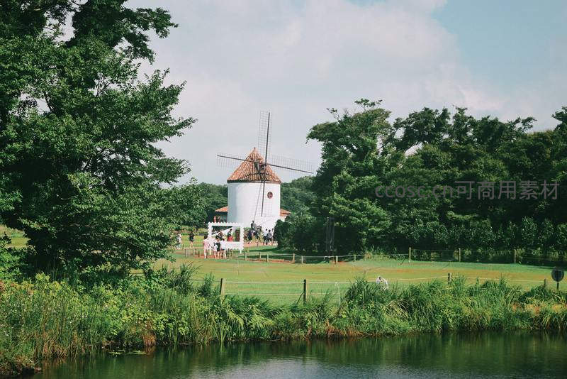 湖畔绿荫中的白色风车