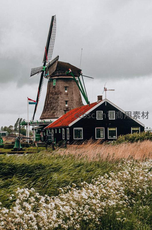 深色木结构房屋配以红色屋顶,与传统风车共同构成经典荷兰乡村图景,前景白色野花增添柔美,充满历史韵味。