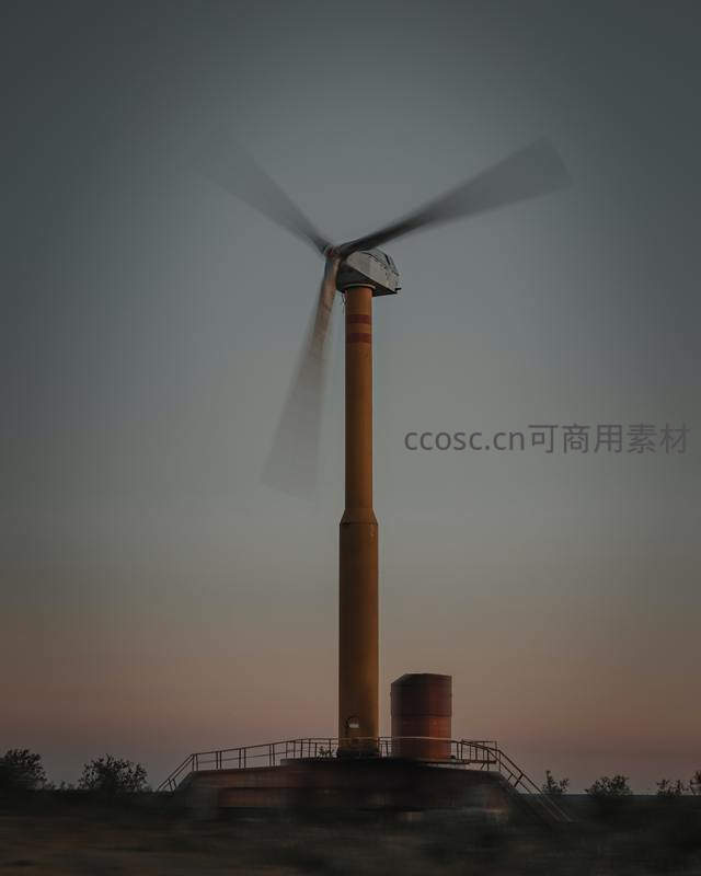 采用长曝光拍摄,捕捉到风力发电机叶片高速旋转的动态模糊效果,突显其强大的动能转换能力,背景是沉静的暮色天空。