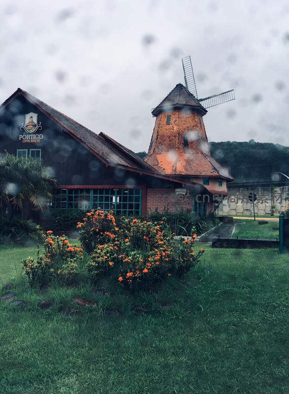 雨滴轻拂玻璃,映衬着红瓦风车与橙色花丛,古朴建筑在湿润空气中更显宁静,仿佛时间在此刻凝固。