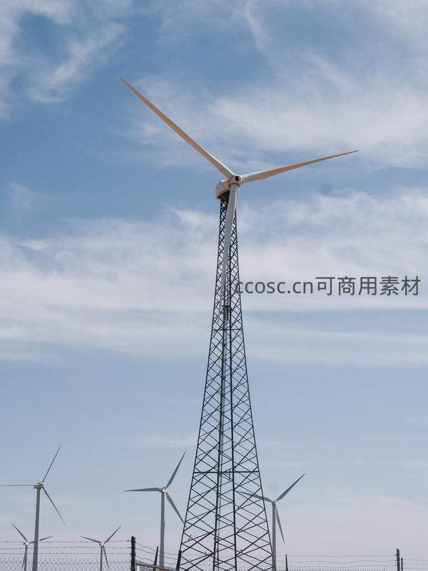 高耸的风力发电机矗立在晴朗天空下,叶片随风旋转,为现代工业提供绿色电力,象征着可持续发展的未来。
