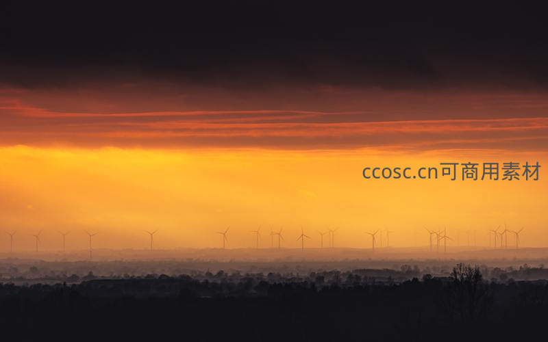 在绚烂的橙红色晚霞下,成排的风力发电机化作黑色剪影,宁静地矗立于薄雾笼罩的平原之上,构成一幅壮丽的能源风景画。