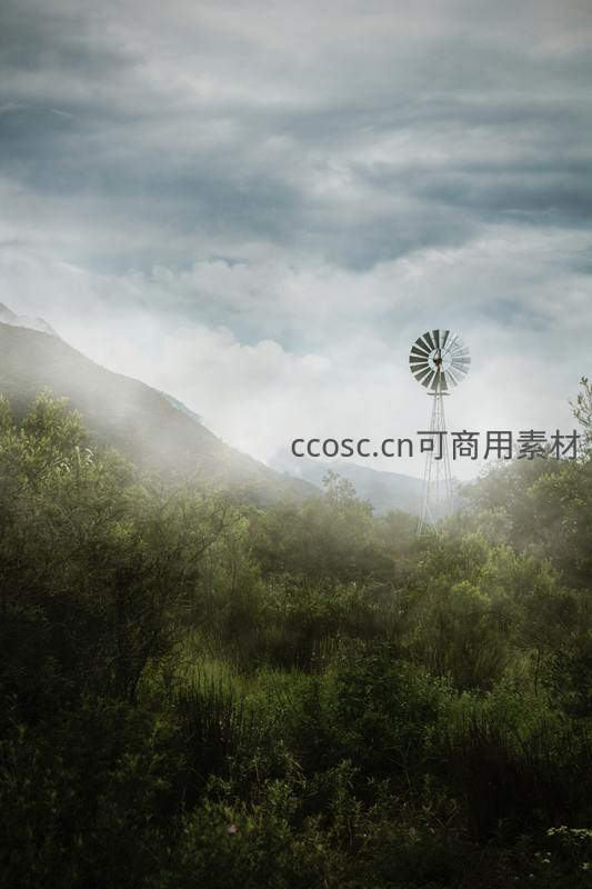 薄雾山谷中的传统风车景致