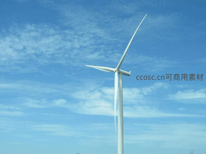 高耸的白色风力发电机在蔚蓝天空下静静运转,叶片划破云层,象征着现代科技与自然环境的和谐共生,为世界提供绿色动力。