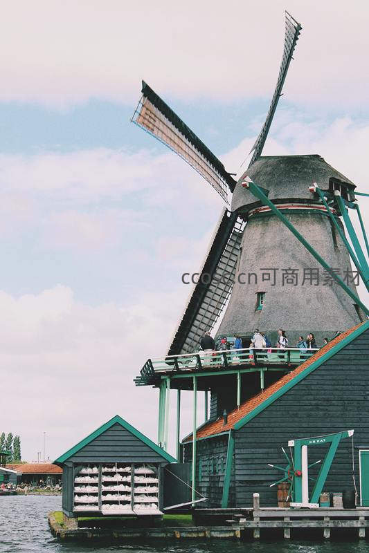 典型的荷兰木制风车临水而建,游客在观景平台上驻足欣赏,周围是宁静的运河与传统建筑,充满了浓郁的异国风情与生活气息。