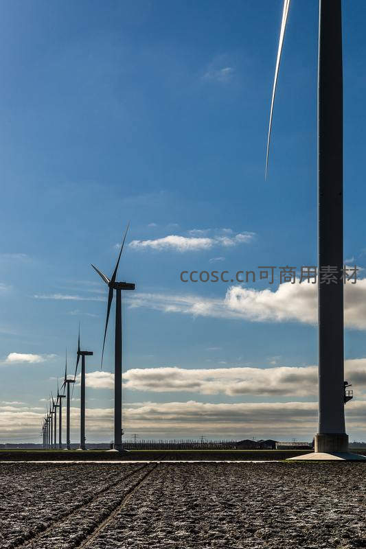 一排排高大的风力发电机矗立在开阔的田野上,蔚蓝天空中飘着几缕白云,展现出清洁能源与自然和谐共存的景象。