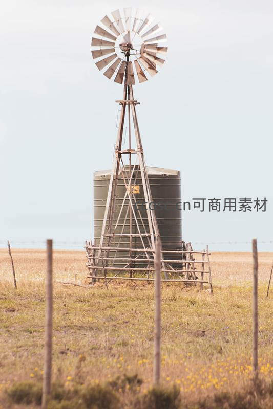 草原上的复古风车与储水罐