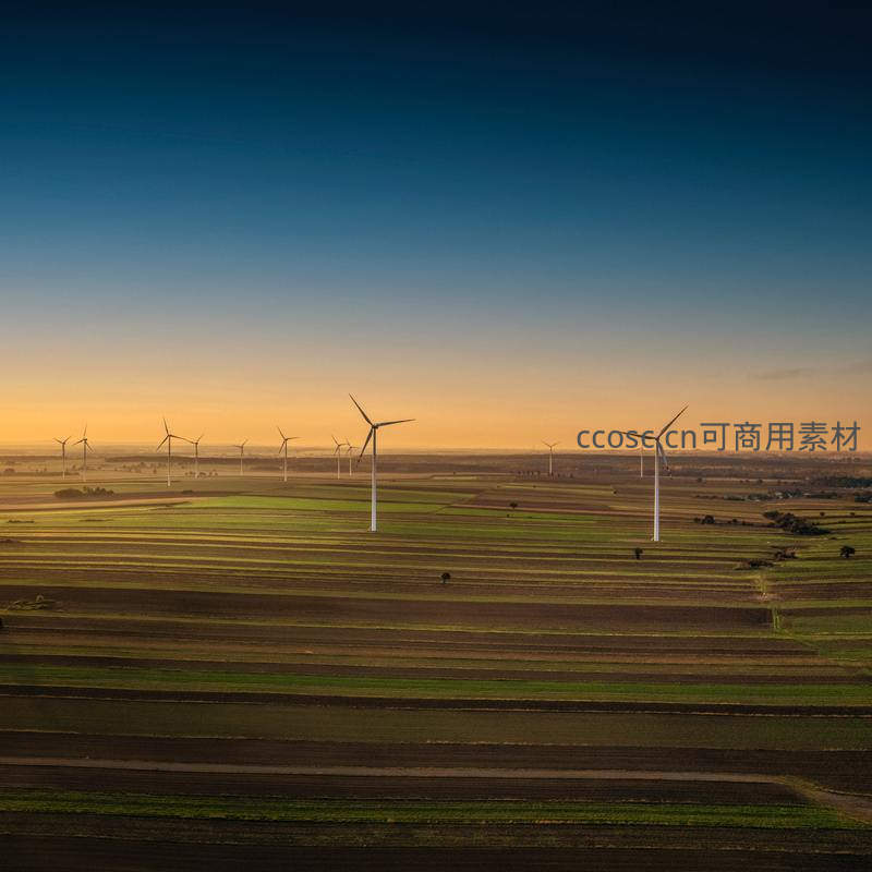 高空俯瞰视角下,成排风力发电机矗立在条纹状的广阔农田中,晨光为大地镀上金边,展现可再生能源与农业生产并存的壮丽景观。