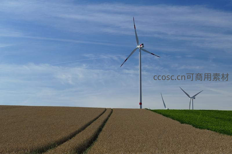 广袤的田野上,高耸的现代风力发电机静静运转,叶片在蓝天白云下划出优美的弧线。金黄麦田与青翠作物形成鲜明对比,象征着现代农业与清洁能源技术的和谐共生。