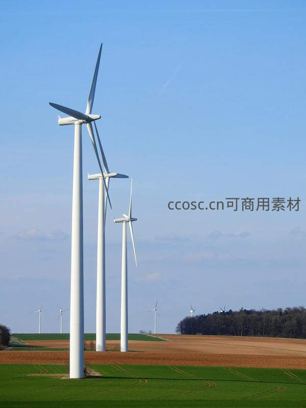 数台巨大的白色风力涡轮机整齐排列在广袤的田野间,湛蓝的天空下,它们如同现代工业的巨人,默默为大地输送着清洁、可持续的绿色能源。