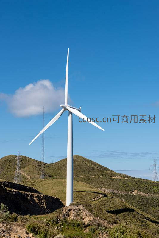 一座高大的白色风力发电机矗立在连绵起伏的绿色山丘之巅,背景是湛蓝的天空和飘动的白云,远处可见输电塔,展现现代能源与自然和谐共存。