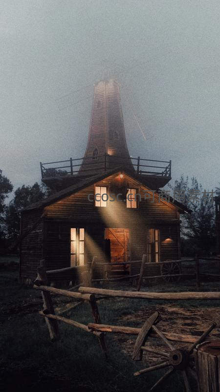 一座古老的木制风车小屋笼罩在薄雾之中,窗内透出暖黄色的灯光,为幽静的夜晚增添了一丝温馨与神秘感。
