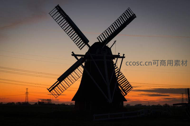 夕阳剪影下的传统风车轮廓