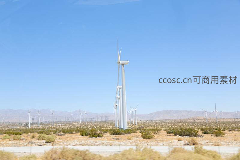 在广袤的干旱荒漠中,一排排高耸的白色风力发电机矗立于稀疏灌木之间,远处是连绵山脉,象征着科技对自然资源的利用。