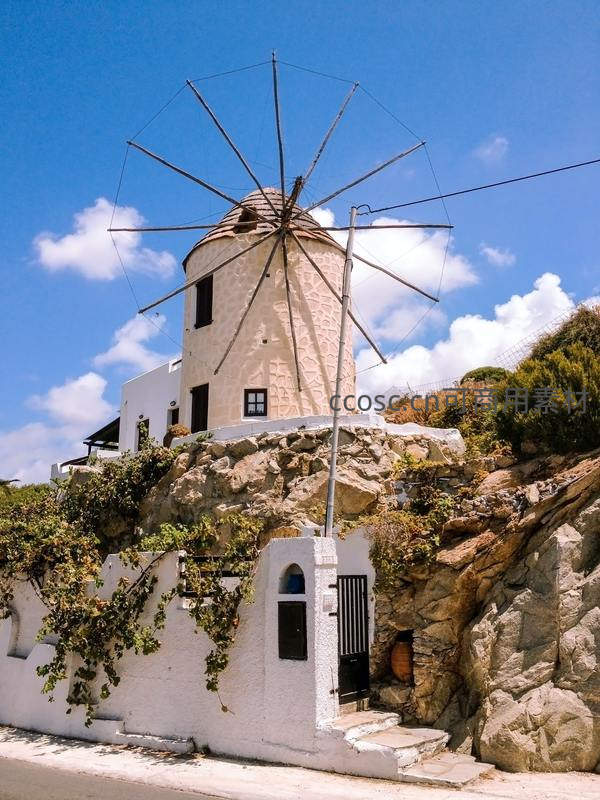 希腊海岛白色风车与蓝天白云相映成趣