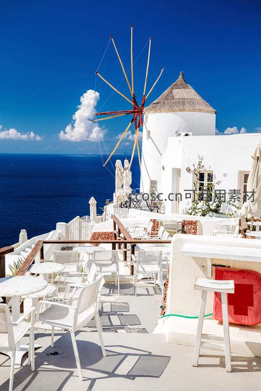 圣托里尼白屋风车,蓝海晴空下的浪漫景致