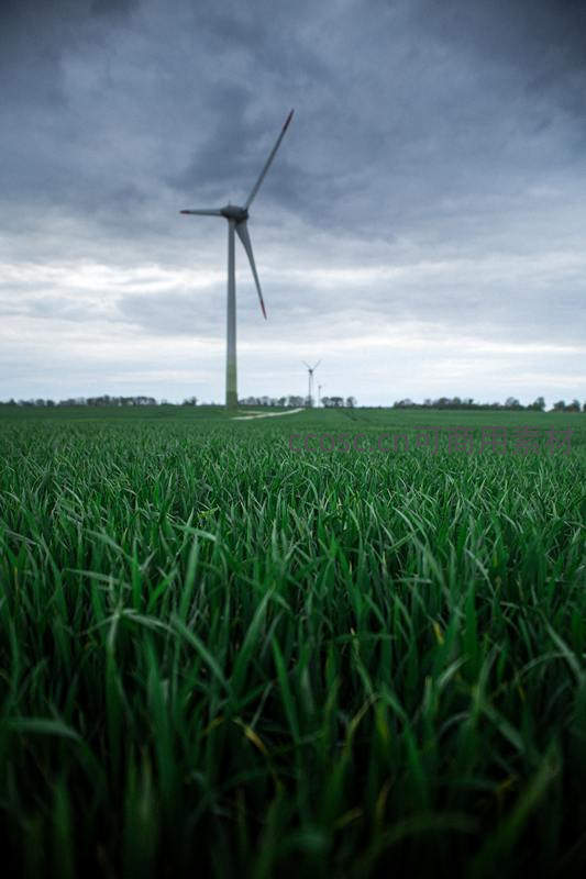 风电塔耸立麦田,乌云密布预示风雨将至