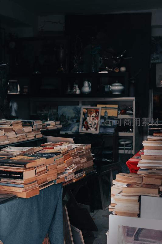 在幽暗的室内空间里,成堆的旧书随意堆放,书页泛黄,透露着岁月的痕迹。背景中隐约可见装饰品和画作,营造出一种沉静而富有故事感的氛围。