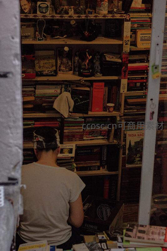 书迷在杂乱书架间寻宝,沉浸于二手书的世界